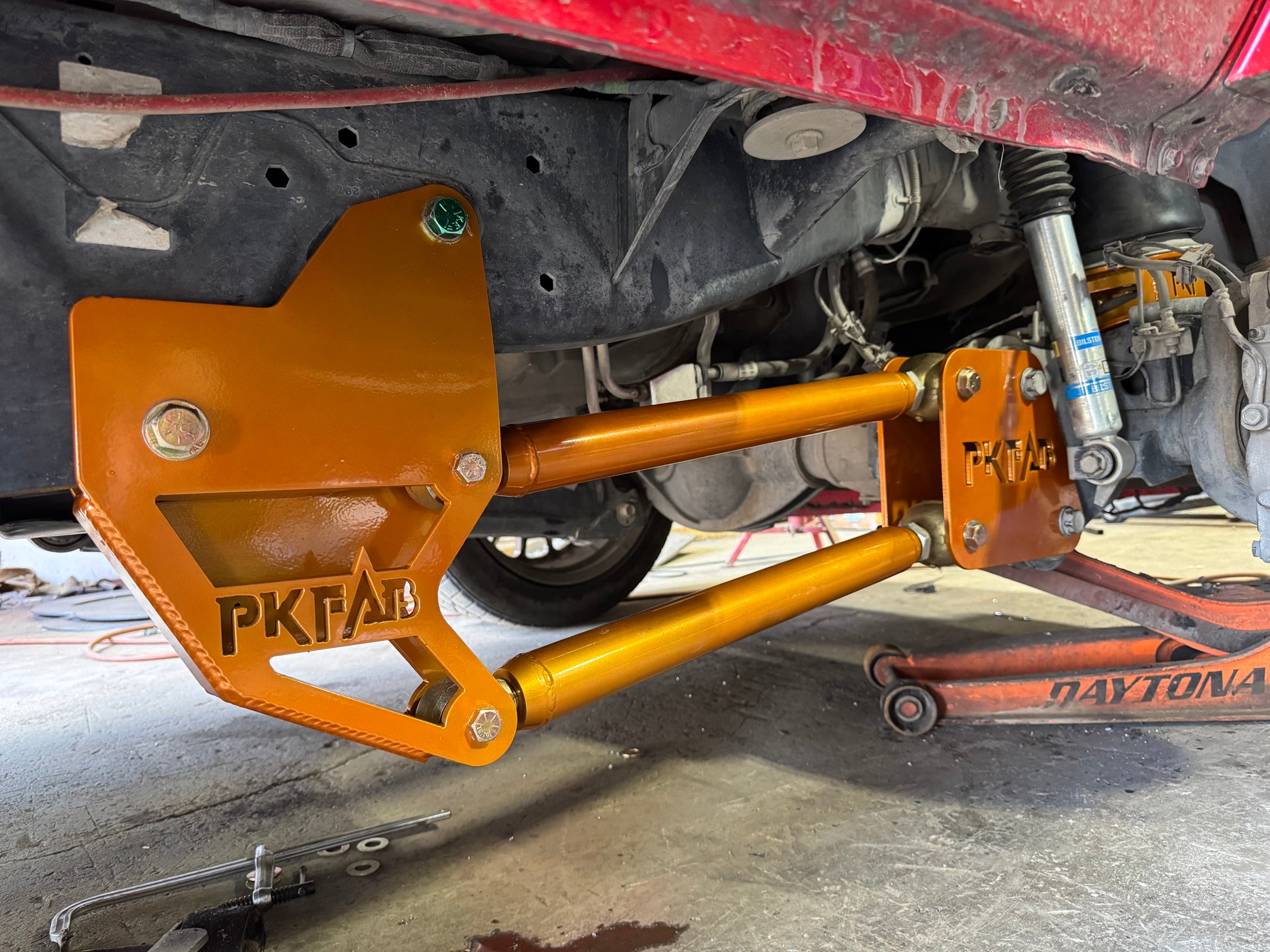 The added plate connecting the axle to another set of johnny joints is something we came up with at PKFAB after seeing the difficulty installing the generic 4 link kits on the market, it’s hard to adjust and align if you’re not wanting to remove your entire suspension, or want to install on a leveled truck and go up to a lift in the future.